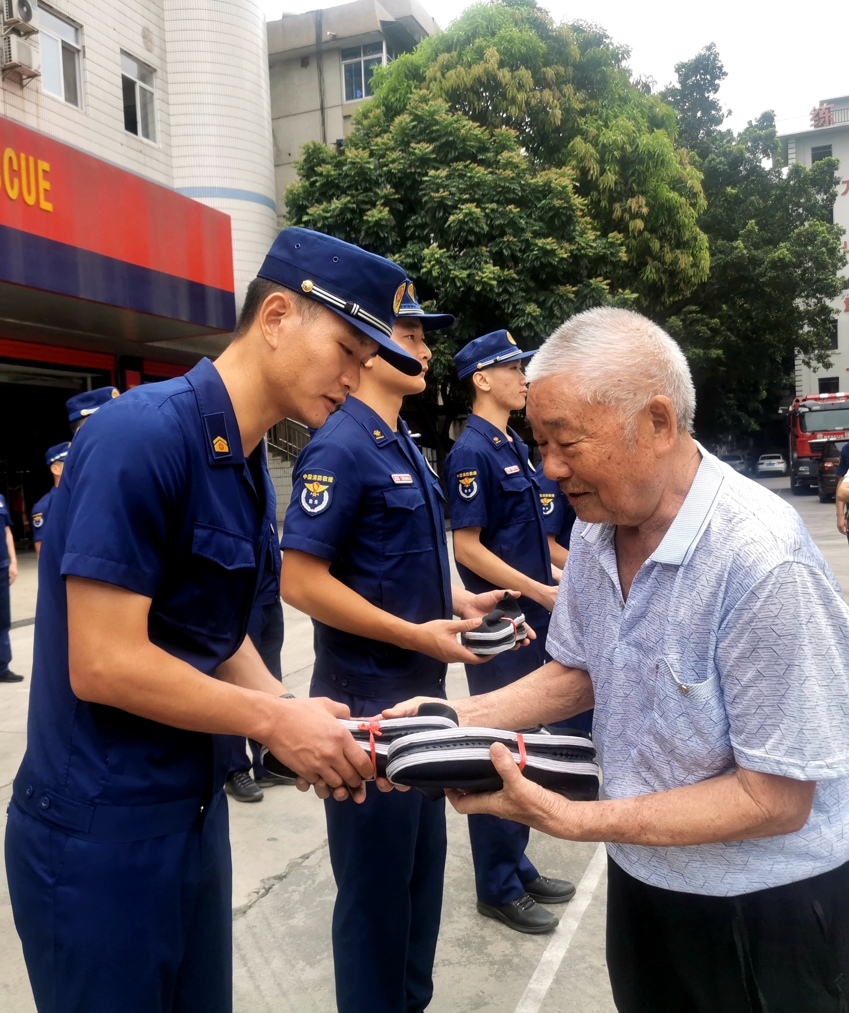 今年,唐明现的家人增加了赠送布鞋、鞋垫的点位,盐边县玉泉路消防救援站就是其中之一。“敬礼!”87岁的张思成老人用微抖的双手,将一双双布鞋、鞋垫送给消防员,眼眶泛红,“这是老伴的心愿,也是我们纪念她的方式,只要我走得动,就会送下去。”老人哽咽。