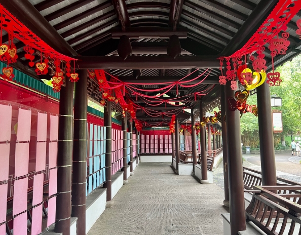 当天,忠山公园相亲长廊正式开放。记者看到,这条百米长廊的一侧整齐挂着粉色、蓝色卡纸,分别展示了女士和男士的征婚信息。长廊顶部,有红色爱心剪纸,烘托出浪漫氛围。来往群众不时驻足观看、讨论。