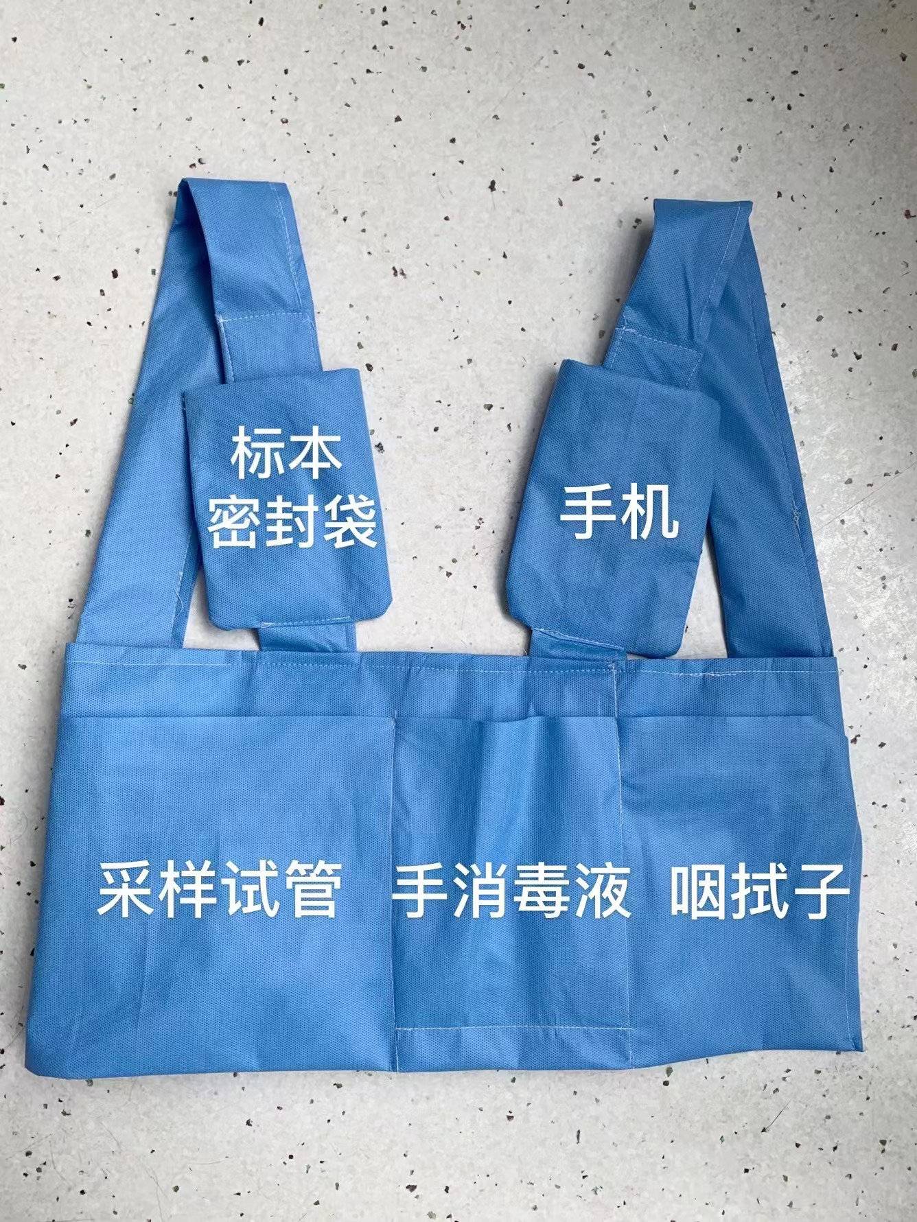 专为核酸采样人员设计,由1条腰带、2条肩带和5个不同大小的储物袋组成,侧面腰带上可据需要再增加2个储物袋,没有一块“多余”布料,容量却不“小”——最多可容纳200支采样棉棒、一瓶500毫升的手部消毒液、100支核酸采样试管、100个标本密封袋和1部手机。