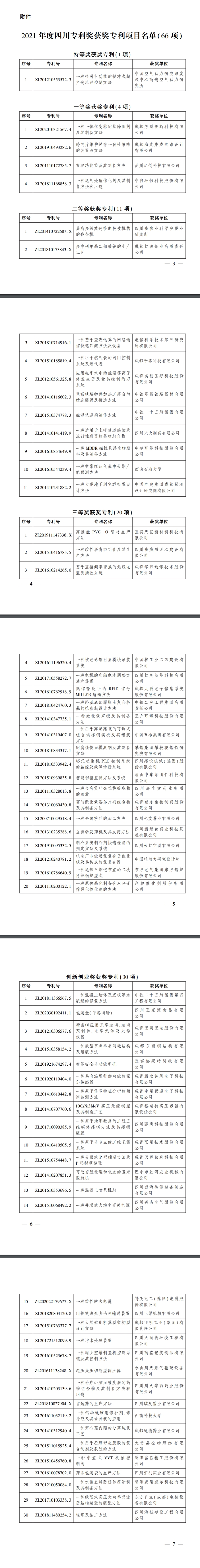 为深入贯彻落实习近平总书记关于知识产权工作的重要论述和习近平总书记来川视察重要指示精神,全面推动省第十二次党代会精神落地落实,加快建设“国家引领型知识产权强省”,根据《四川省专利实施与产业化激励办法》,经四川省专利实施与产业化奖(以下简称四川专利奖)评审委员会评审,省政府决定授予“一种带引射功能的暂冲式超声速风洞控制方法”1项专利四川专利奖特等奖,授予“一种尾气处理催化剂及其制备方法和用途”等4项专利四川专利奖一等奖,授予“具有多级减速换向拨枝机构的伐条机”等11项专利四川专利奖二等奖,授予“高性能PVC-O管材生产方法”等20项专利四川专利奖三等奖,授予“一种混凝土墙体及底板渗水裂缝的修复方法”等30项专利四川专利奖创新创业奖。