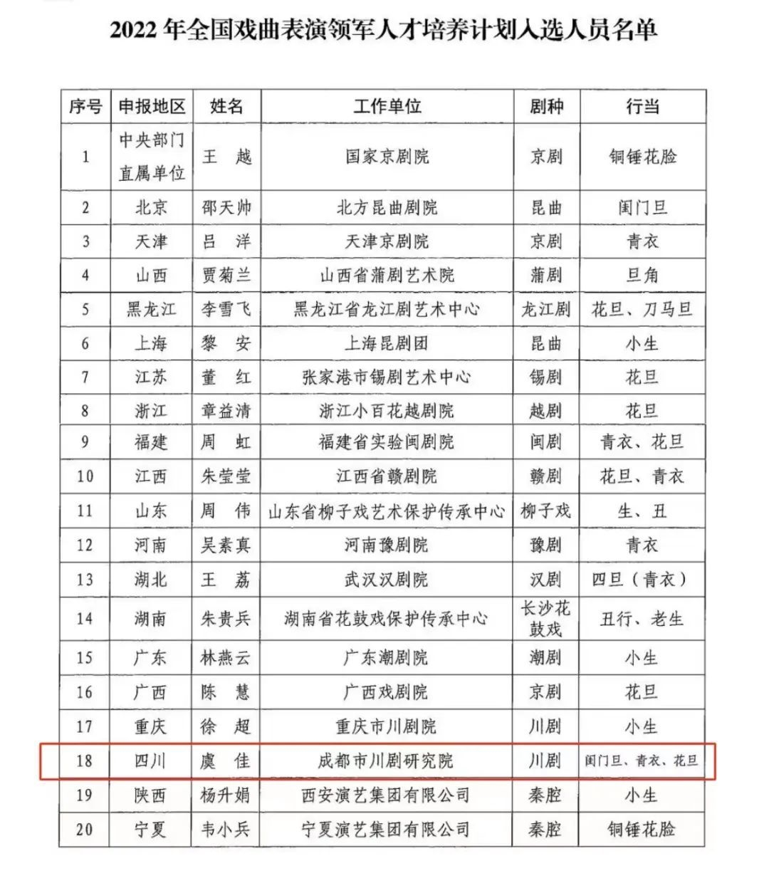 8月8日,记者从四川省文旅厅获悉,据文化和旅游部办公厅发布的关于公布2022年全国戏曲表演领军人才培养计划入选人员名单通知,2022年全国戏曲表演领军人才培养计划的遴选工作已经顺利完成,共有20人入选,我省成都市川剧研究院的国家一级演员、中国戏剧梅花奖获得者虞佳入选。