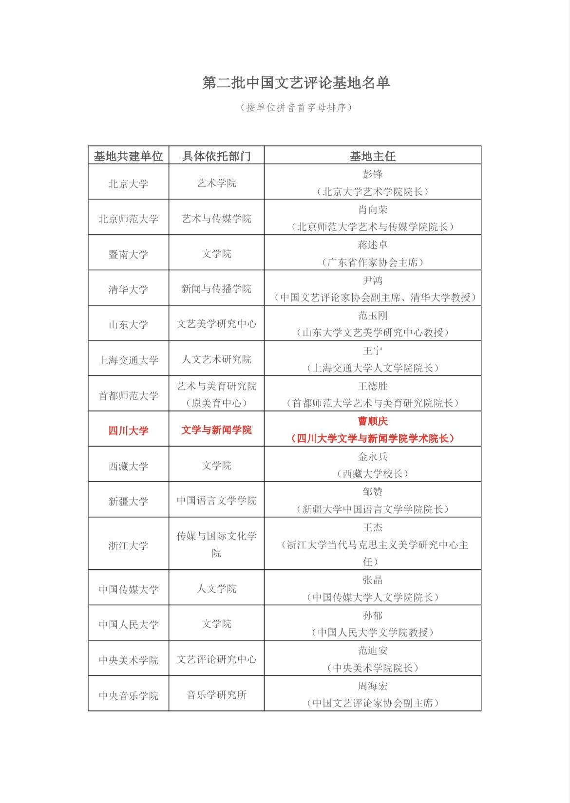 记者8月9日从四川大学获悉,全国第二批“中国文艺评论基地”名单日前公布,四川大学与北京大学、清华大学、浙江大学、中国人民大学、北京师范大学、山东大学、中国传媒大学、中央美术学院、中央音乐学院等单位被批准设立“中国文艺评论基地”。