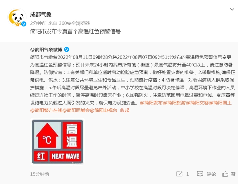 简阳市气象台2022年08月11日09时28分将2022年08月07日09时51分发布的高温橙色预警信号变更为高温红色预警信号:预计未来24小时内我市所有镇(街道)最高气温将升至40℃以上,请注意防暑降温。