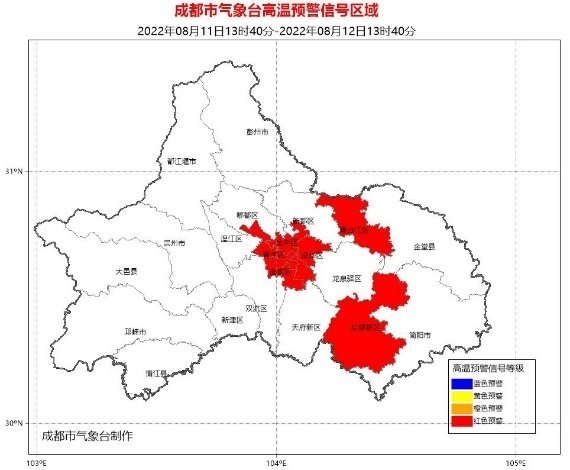 成都市气象台2022年08月11日13时40分将2022年08月07日10时00分发布的高温橙色预警信号变更为高温红色预警信号:预计东部新区、锦江区、青羊区、武侯区、成华区、金牛区、高新南区、高新西区和青白江区的全部镇(街道)未来24小时内最高气温将升至37℃以上。请加强防范。