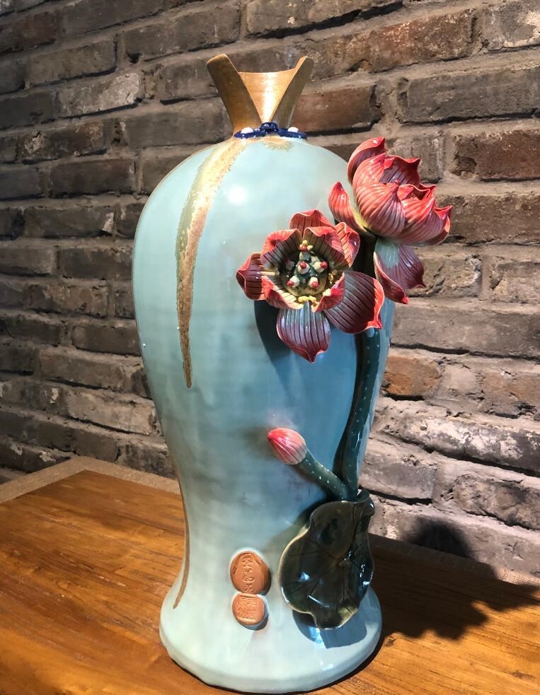 在李梅的工作室里,“圣莲花陶”系列文创很显眼,古朴、粗犷的陶器上,绿意流淌,娇艳欲滴的荷花绽放。