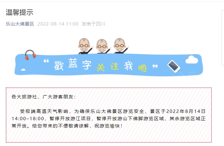 乐山大佛景区官方微信8月14日发布温馨提示,受极端高温天气影响,为确保乐山大佛景区游览安全,景区于2022年8月14日14:00–18:00,暂停开放游江项目,暂停开放游山下佛脚游览区域,其余游览区域正常开放。给您带来的不便敬请谅解,祝游览愉快!