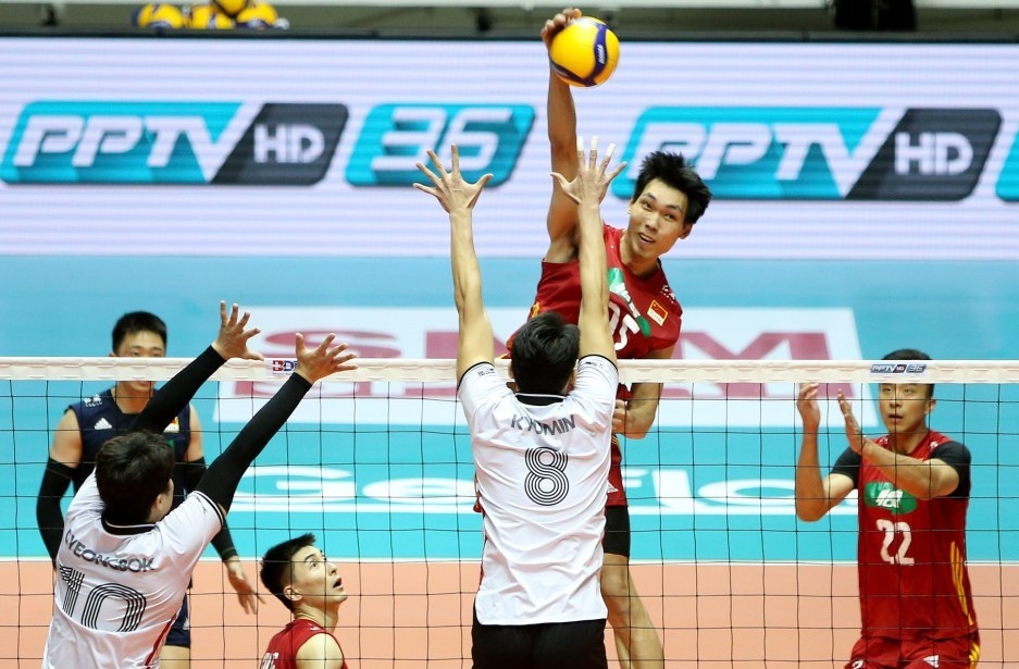 中国男排再夺亚洲杯冠军。图为半决赛中,中国队球员彭世坤(上)在比赛中扣球。新华社发