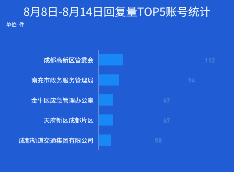 从具体接件办理单位来看,全川回复量排名前五的账号分别为: