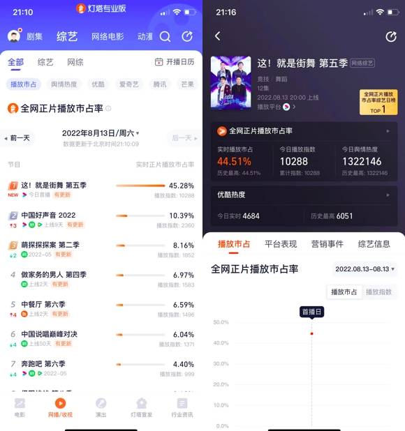 据了解,本季节目因强大的青春能量备受瞩目。作为综艺代表作之一,《街舞5》将镜头对准中国街舞的新生力量,在赛制、开场形式、舞美等诸多方面全面革新。据灯塔专业版显示,节目上线1小时,实时全网综艺正片播放市占率高达45%,独占近半。