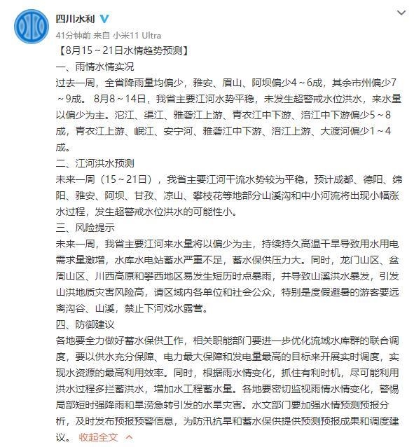 四川省水利厅官方微博8月15日发布一周(8月15~21日)水情趋势预测。