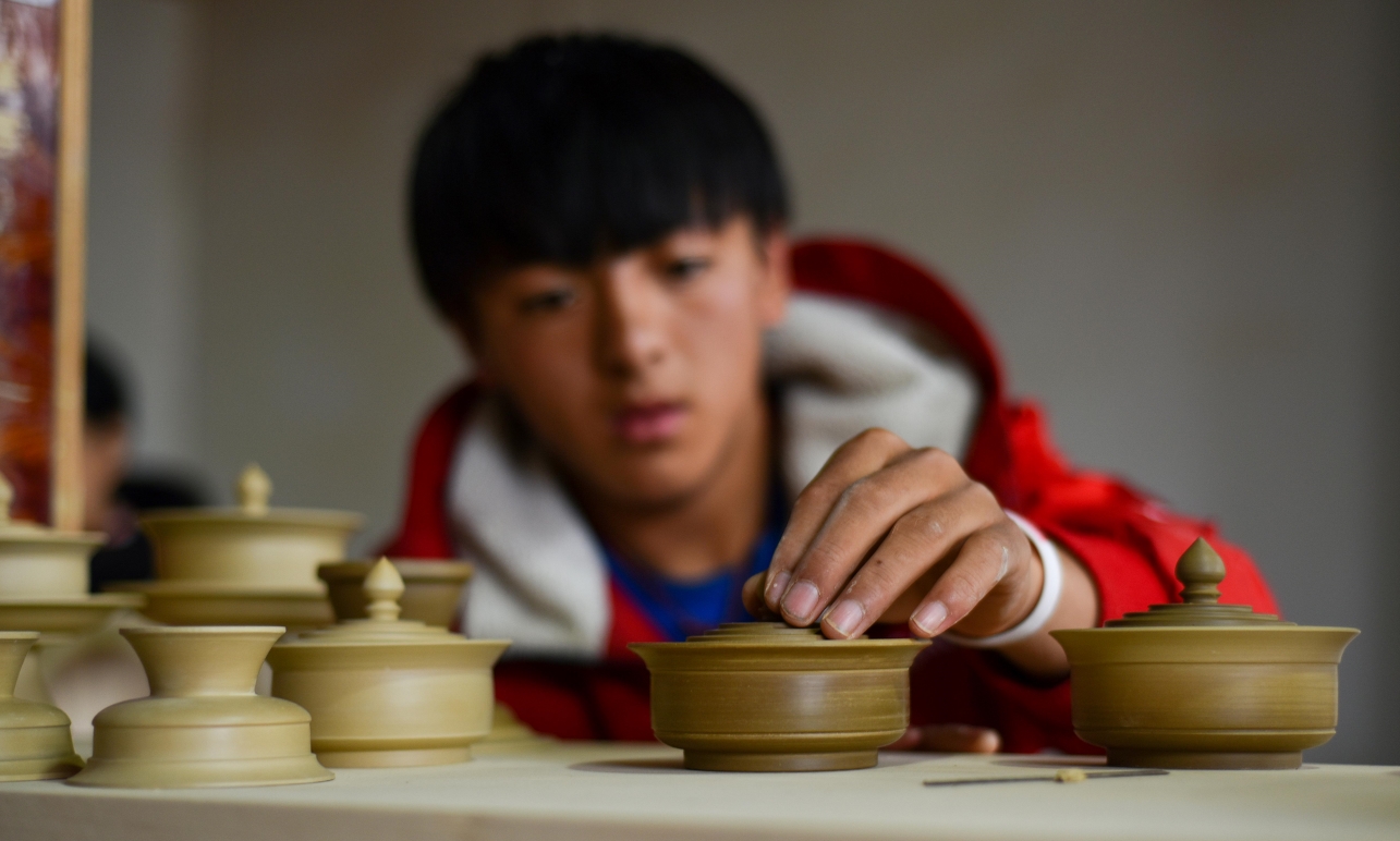 索朗卓玛口中的藏陶,是壤塘的一项非遗,选用当地泥土,用传统方法烧制而成。“最特别的是,制作过程中运用了江西景德镇的烧陶技艺。”