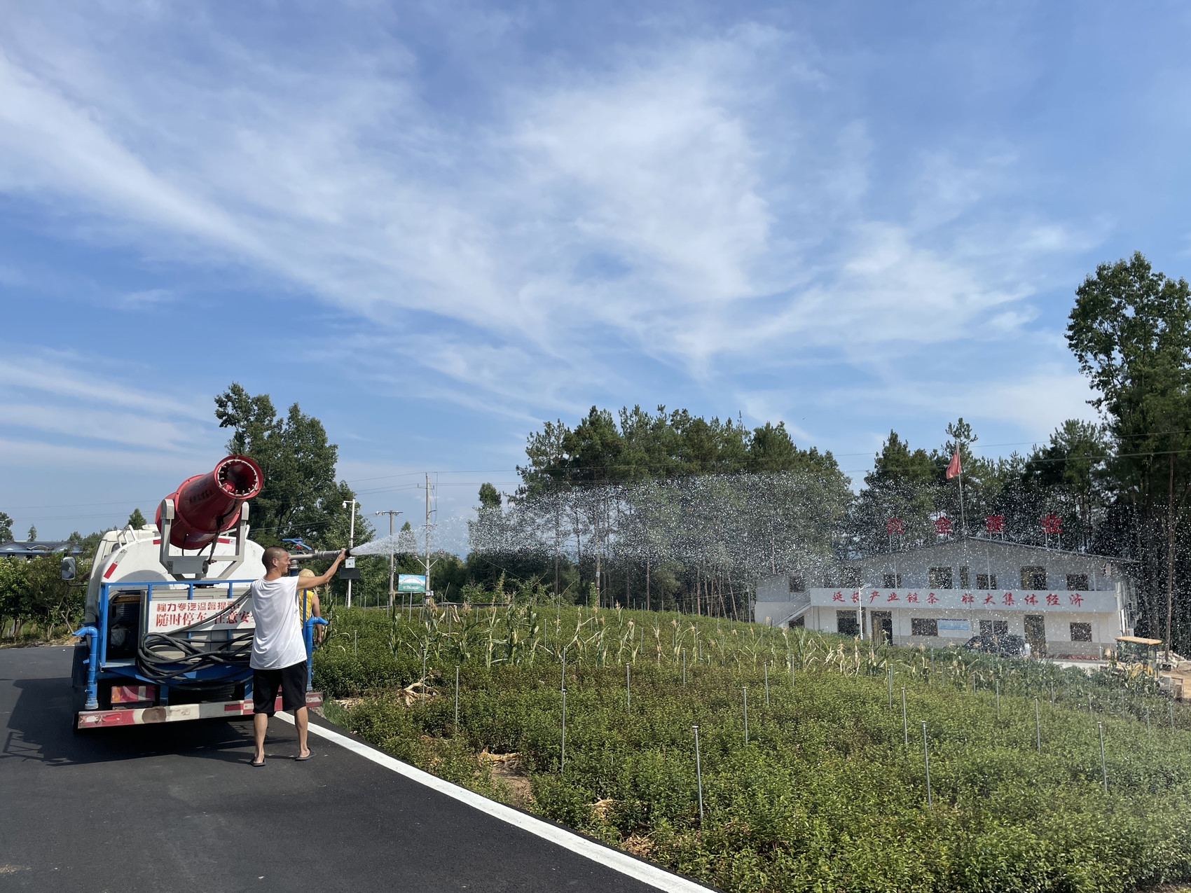 一辆洒水车开进三合村,沿途给茶园浇水。“我们考虑拉水放微水池再抽水浇,成本高,专门调度了一台洒水车到三合村,主要浇道路两边的茶园。”木门镇副镇长张川介绍。