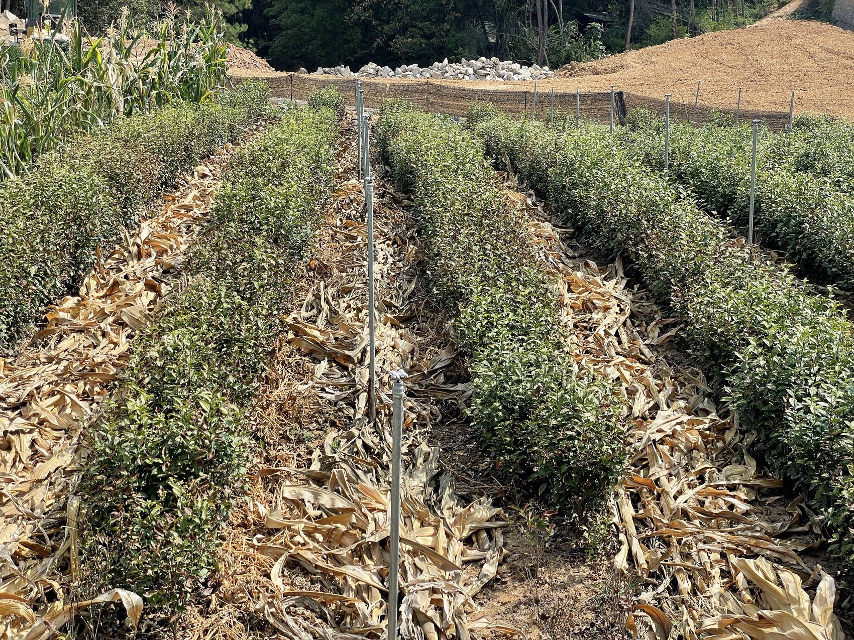 行走在三合村,记者看到有些茶行间,放着干的大豆苗、杂草、玉米秆。“早玉米我们一个月前就收获了,就把玉米秆砍了来护茶,天一旱,原来茶行里种的大豆也保不住了,留着要吸收地里水分,我们干脆砍了,一是可以给茶树保湿,另外还可以固氮。”