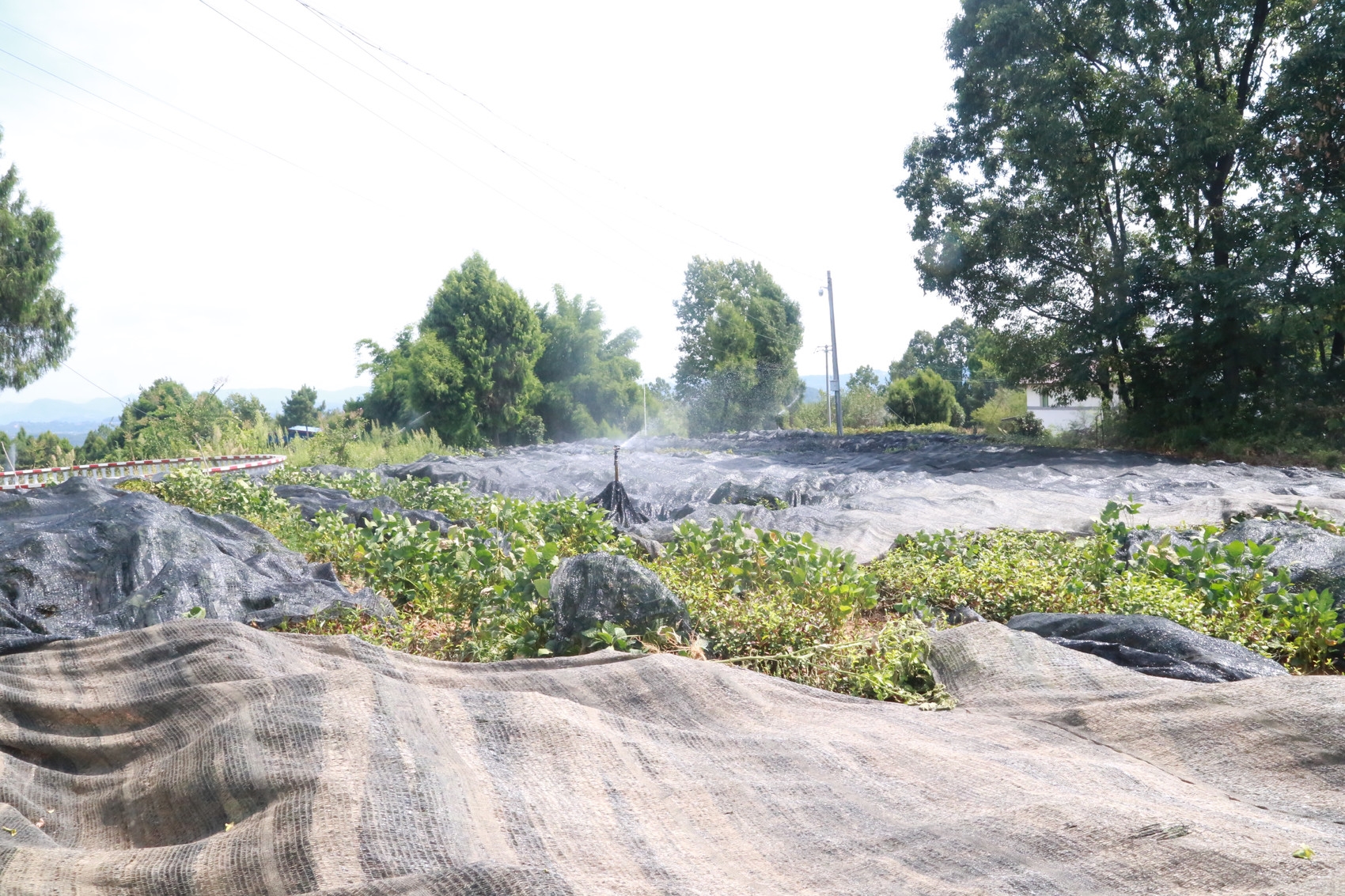 在三合村青龙茶业茶园,茶树上面则覆着一条一条的黑色遮阳网。“遮阳网可以减少暴晒,保叶子,也保苗。”