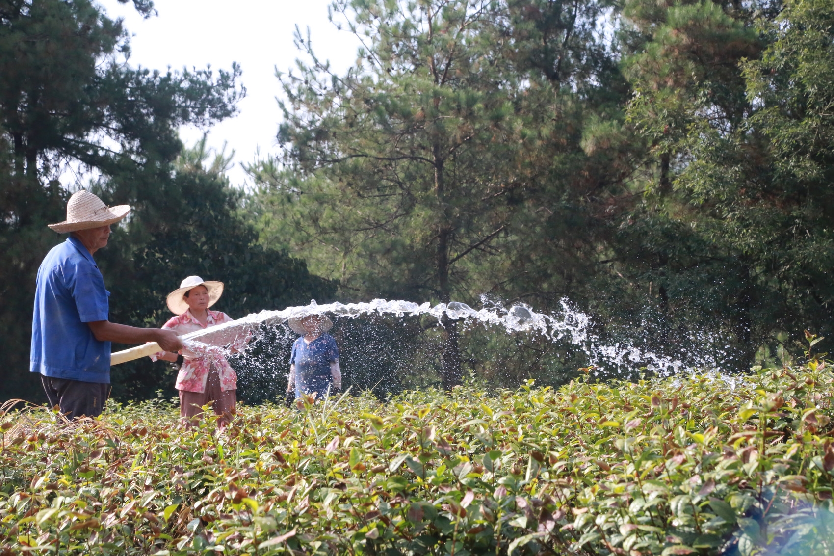 抽水泵机突突地响,微水池的水被抽进一根300米长的白色水管里。上午8时,石义良拖着水管在茶行里来回浇水,后面2个村民抬着水管跟着浇水人走。“莫看这根管子看起不大,拿到手里重得很,浇水走起来一个人拖不动,要几个一起才可以。”石义良说。