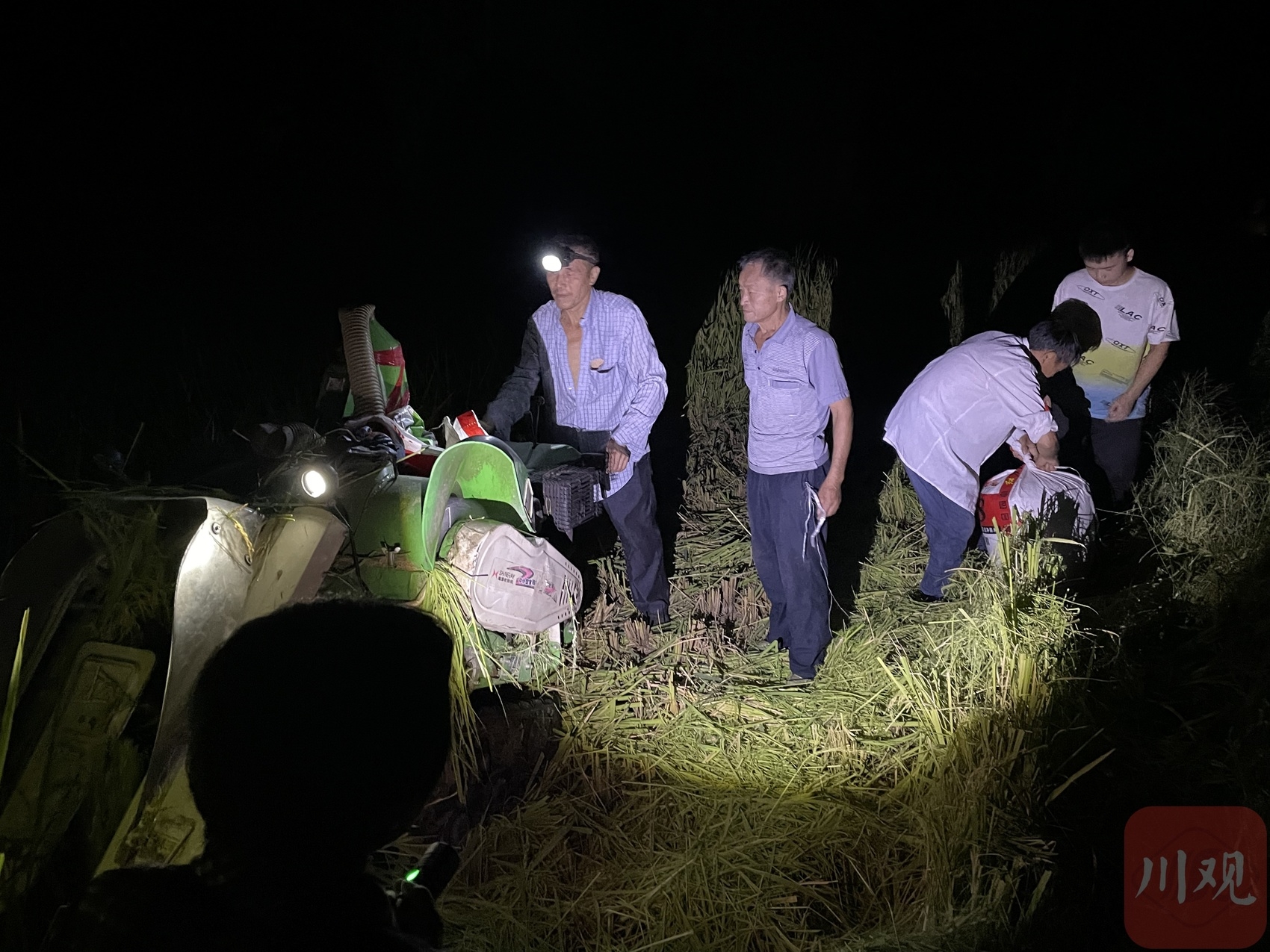 夜色中,祖孙三人与收割机手协同作战,满田水稻,被螺旋收割的“包围圈”在一点点缩小。