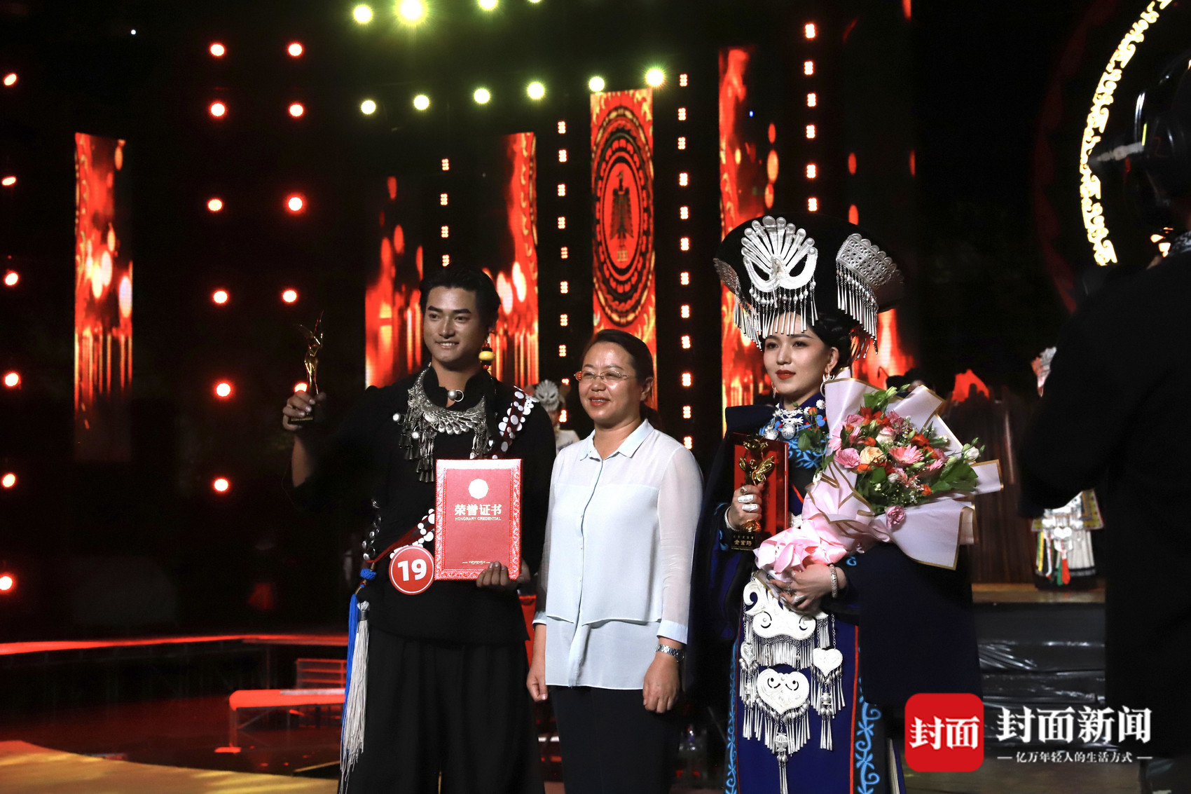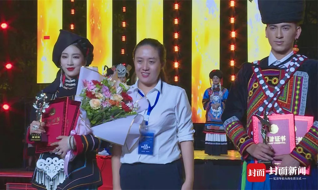 16号曲比韦吉获得“银鹰”的称号,27号王嘉怡获得“银索玛”的称号,西昌市委常委、宣传部长胡英为他们颁奖(图据西昌发布)