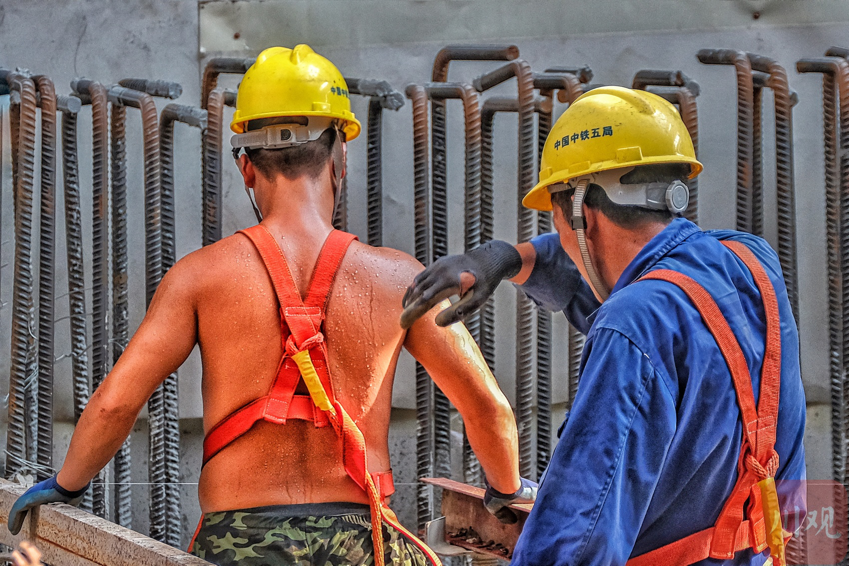 烈日下,施工管理人员和施工工人一起,构成了酷暑里战高温、抢进度的壮观场景。