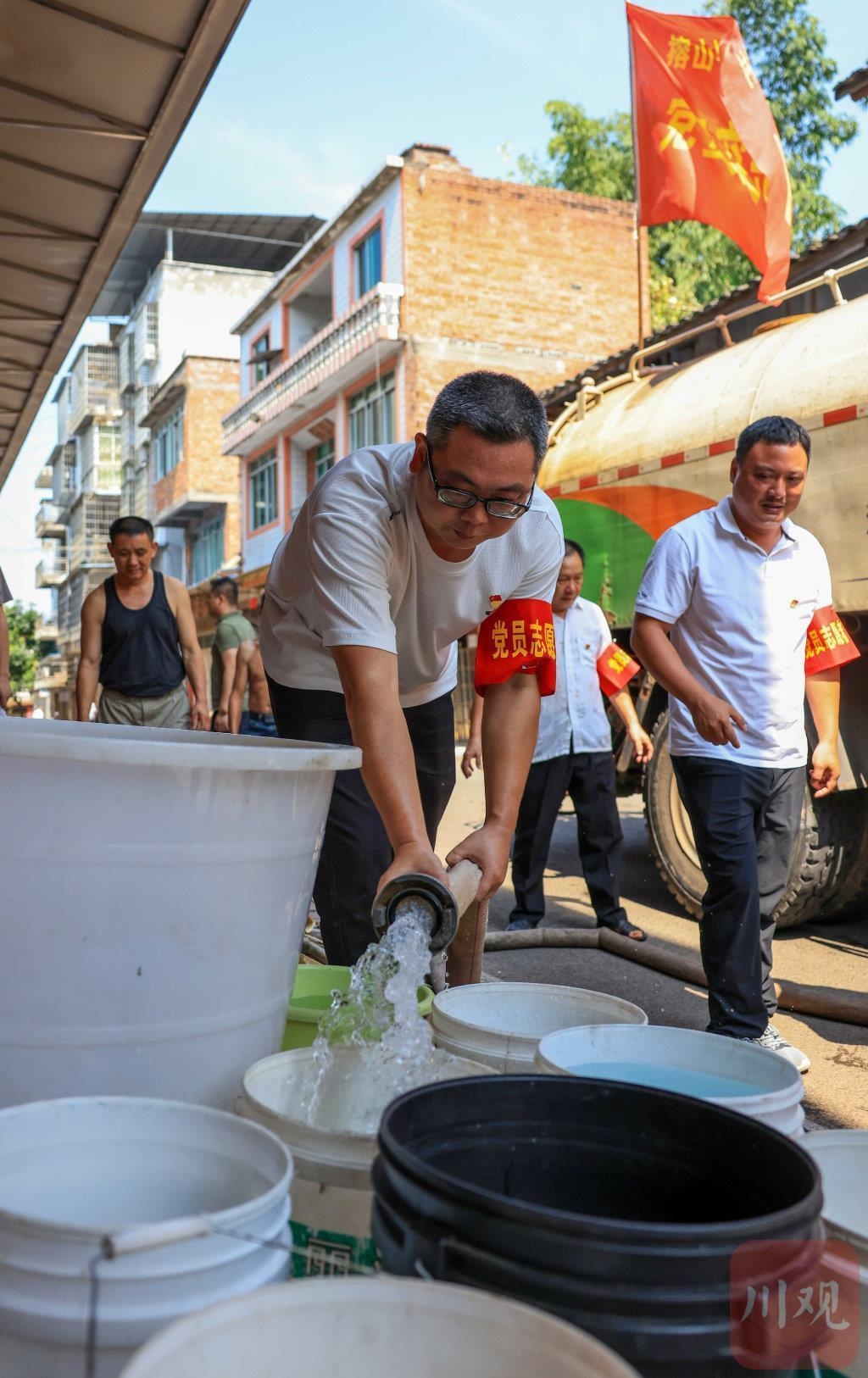 8月13日,泸州市合江县榕山镇进宝村党员志愿者服务队的队员们为辖区缺水群众送水,保障他们正常的生产生活。