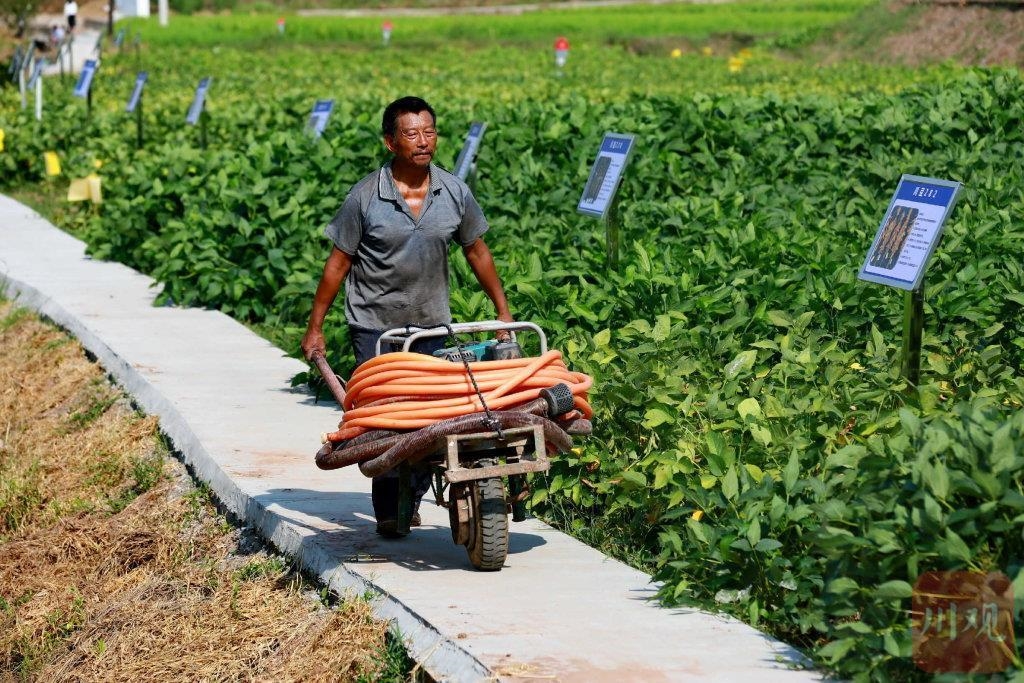 8月18日,遂宁市射洪市瞿河镇牛心村村民正在拉水管为四川省农科院中试熟化基地浇水抗旱保苗。