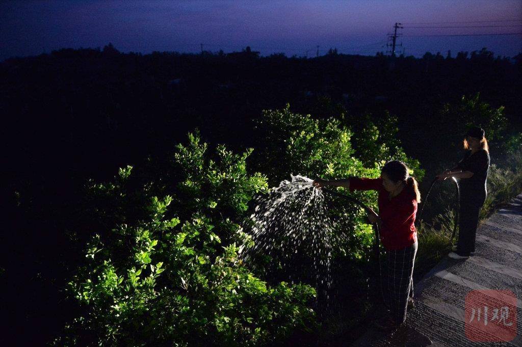8月17日凌晨,唐春蓉血橙种植园里的温度依然高达32℃,果农们戴着头灯穿梭在种植园里,连夜安装喷灌设备。漆黑的林间又湿又热,不一会儿,他们的衣衫就全被汗水湿透了。铺管、焊接、抽水……直到清晨6时30分,种植园里的大面积喷灌设备终于开始运作了,看着喷头旋转着喷射出水花,唐春蓉紧皱的眉头终于舒展开来。目前,资中县建成了全国最大的血橙生产基地,种植面积达到30万亩,产量达到41万吨,占全省的80%、全国的60%。今年夏天,有许多像唐春蓉一样的血橙种植户正在积极开展生产自救,抗旱保收。