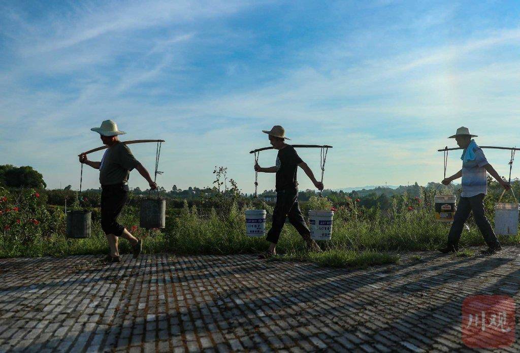 8月14日,广安市华蓥市禄市镇的镇村干部在凉水井村花木基地,带领群众挑水浇灌遭受伏旱袭击的苗木。