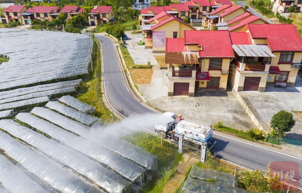 8月18日,水罐车在为巴中市恩阳区下八庙镇安居村葡萄产业园喷水抗旱 。