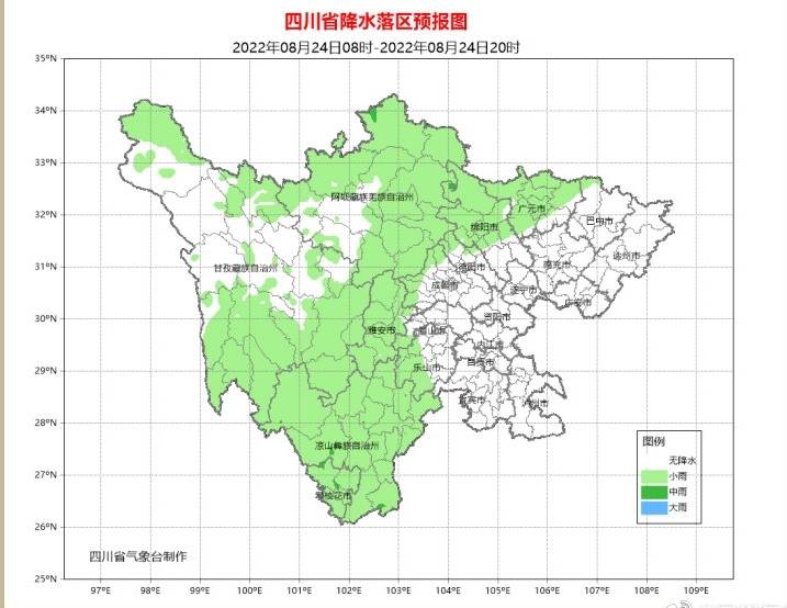 今天(8月24日)晚上,预计广元、雅安2市大部和绵阳、德阳、成都3市西部有中雨,局部地方有大雨到暴雨;川西高原北部和攀西地区多云间晴有分散阵雨或雷雨。