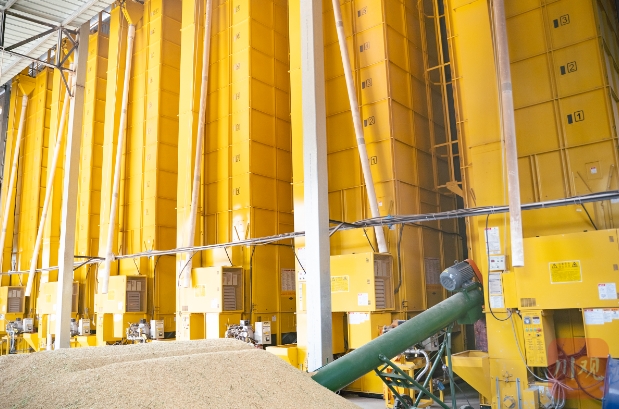 经过绿色的金属传送管道,一旁的稻谷堆越来越矮,注入到这个烘干机的“肚子”中。想要填饱一个烘干机,需要约12吨稻谷。在机械的轰鸣声中,该公司工作人员易双林目不转睛,紧盯着机器操作面板上跃动的红色数字。显示温度的一栏在60℃左右跳动,另一栏显示装入的水稻的水分含量,数字是21%。