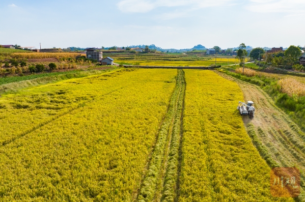 内江市资中县公民镇,易小杰承包的稻田开展机械化收割作业 唐广 摄