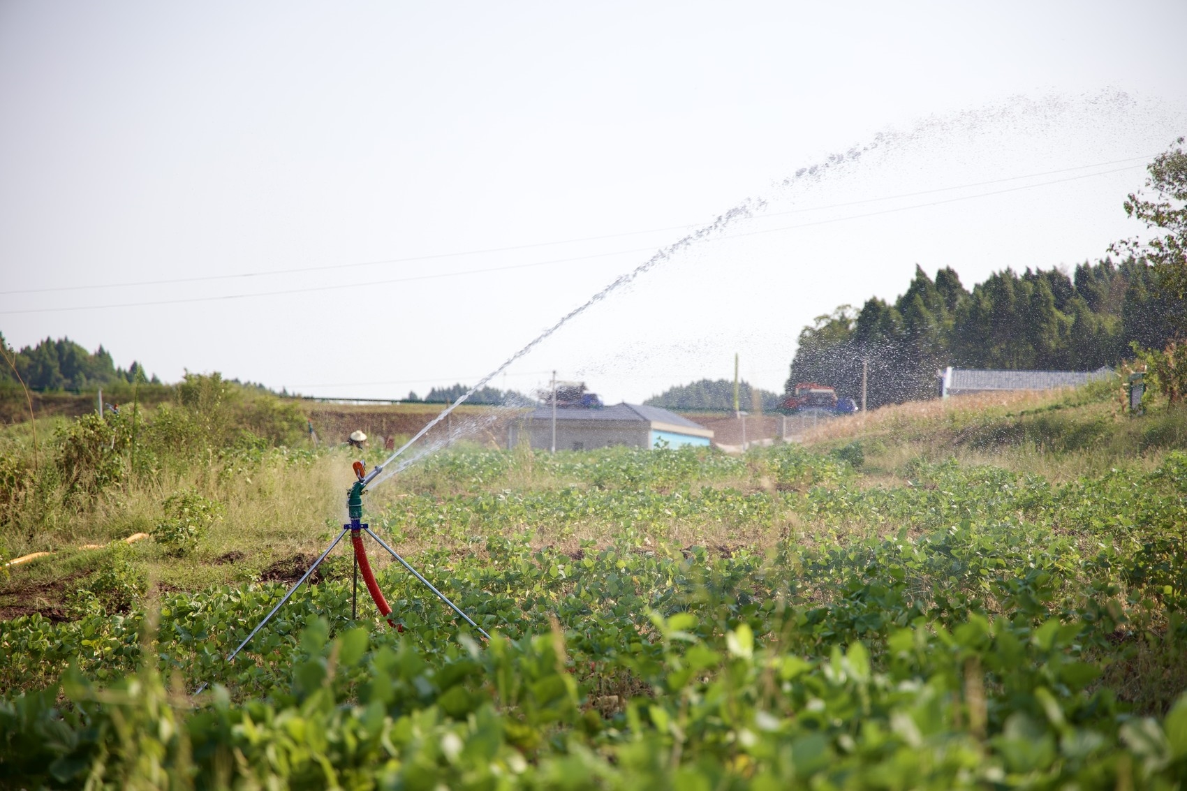 溪流灌满了水,种植户就近用抽水机抽水,再通过水带接上架设在田地中心的自动喷灌装置,随着喷头的旋转作业,密集的水雾,便均匀地喷洒在大豆上。