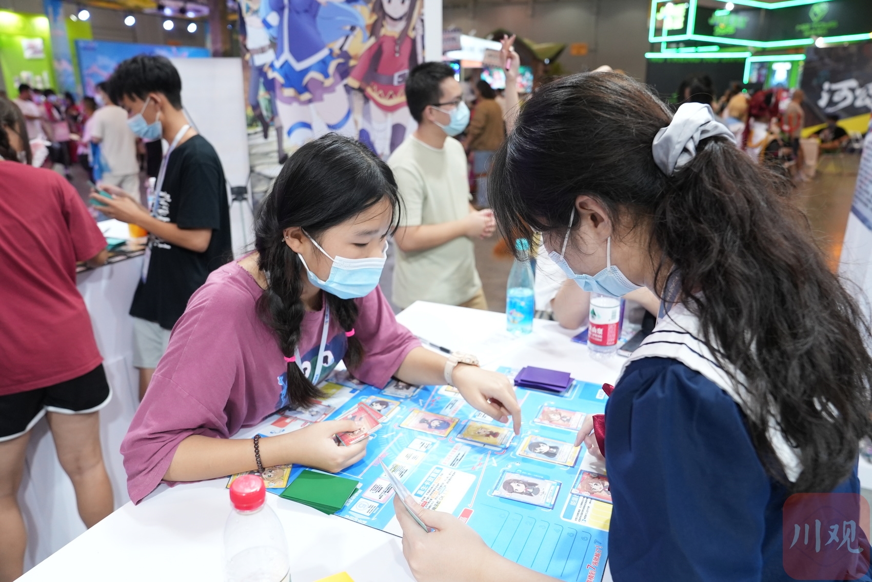 在一处卡牌游戏展位,玩家们正在进行一场卡牌游戏
