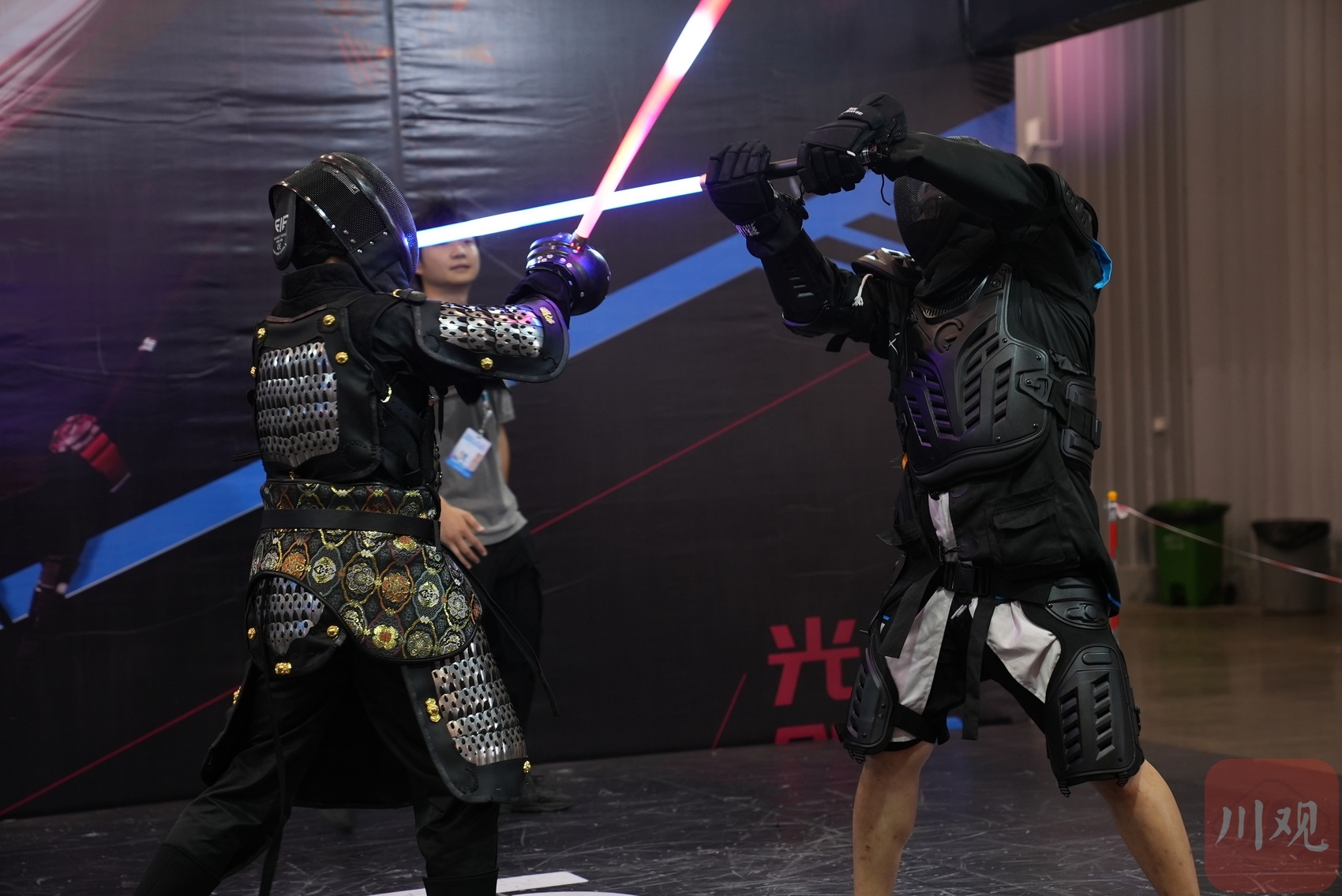 光剑决斗擂台上,两名男生穿戴着护具,体验着用光剑决斗的感觉