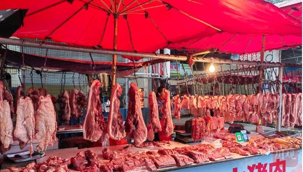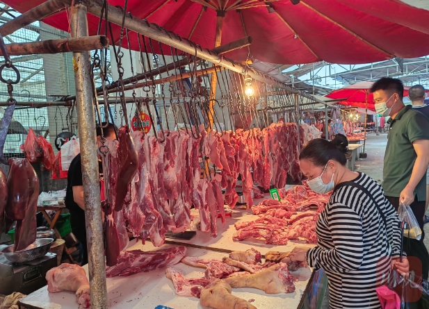 记者在农贸市场内,发现市场内菜品丰富,价格也与平常保持一致。在一家售卖跑山猪肉的摊位前,老板告诉记者,猪肉23元/斤、排骨28元/斤,“价格上,与平常差不多。我今天进了两头猪,货源上绝对充足。因为昨天大部分人家里都买了一些,今天来买的,一般都是想吃新鲜肉的。”