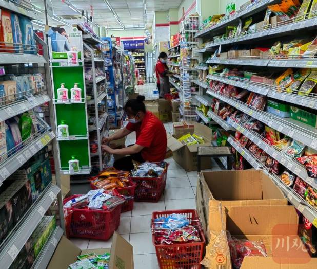 武侯区桐梓林北路8号附近的红旗连锁超市内,工作人员随时进行补货。 张明海 摄
