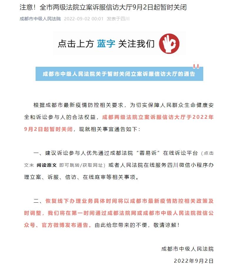 9月2日,记者从成都市中级人民法院获悉,根据成都市最新疫情防控相关要求,该法院发布《成都市中级人民法院关于暂时关闭立案诉服信访大厅的通告》。根据《通告》,成都两级法院立案诉服信访大厅于2022年9月2日起暂时关闭,建议诉讼参与人优先通过成都法院“蓉易诉”在线诉讼平台或者人民法院在线服务四川微信小程序办理立案、诉服、信访、在线庭审等相关事项。