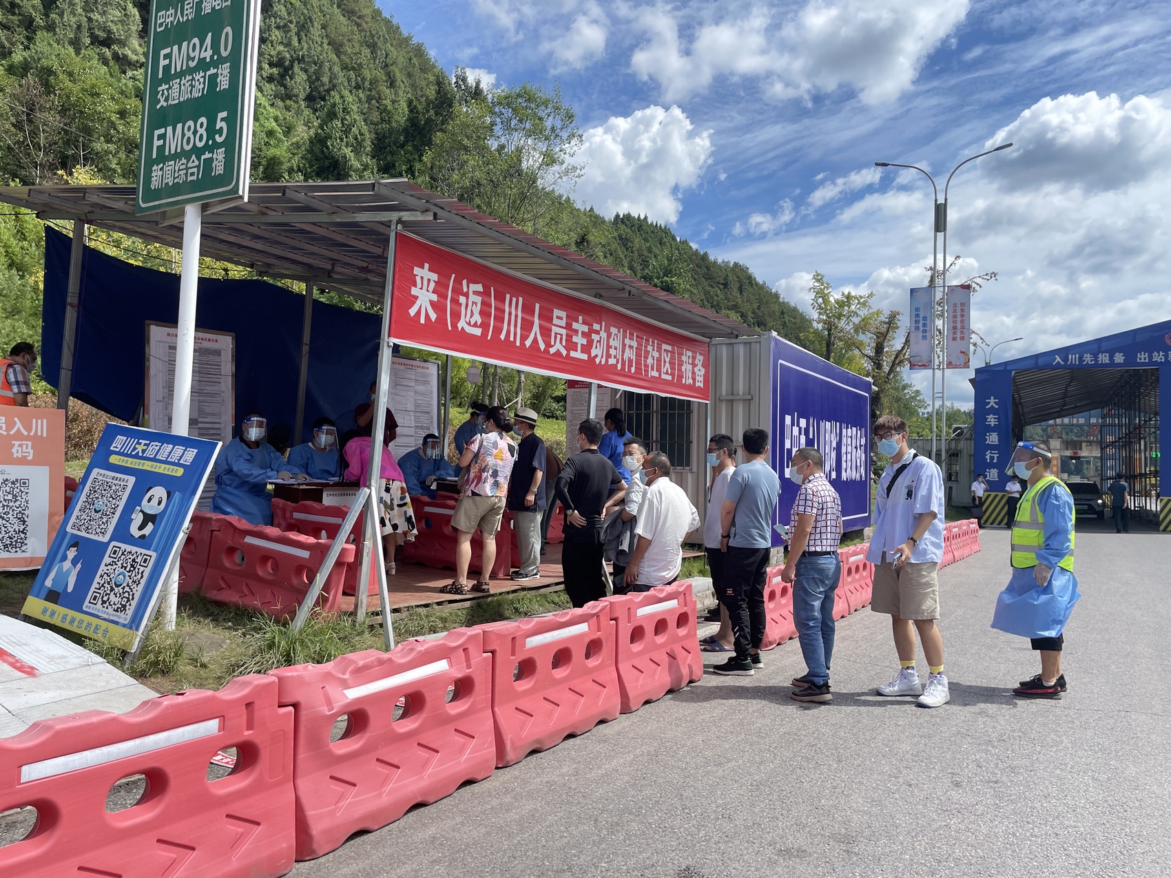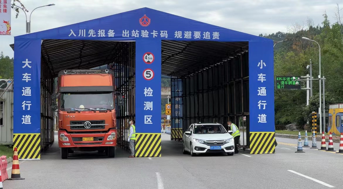 “过往车辆人员请打开风险城市旅居史、健康码、行程码……”中午12点多,当入川车辆驶出巴中西高速路收费站出口、进入两个蓝色帐篷搭建的人工检测区时,两名防疫人员迎了上来,引导入川车辆有序停靠,并查验司乘人员的健康码、行程卡、核酸检测报告等。