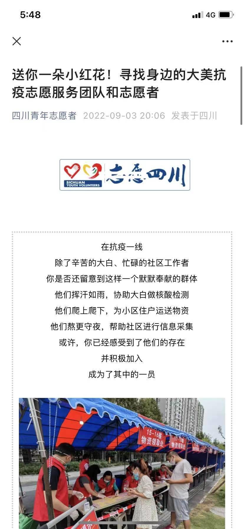 在省委办公厅、省政府办公厅印发《关于组织党员干部下沉基层一线参加疫情防控工作的通知》后,川观新闻积极响应号召,于9月2日联合四川省志愿服务联合会、四川青年志愿者协会启动“寻找你身边的大美抗疫志愿服务团队和志愿者”活动,目前正在火热进行中。