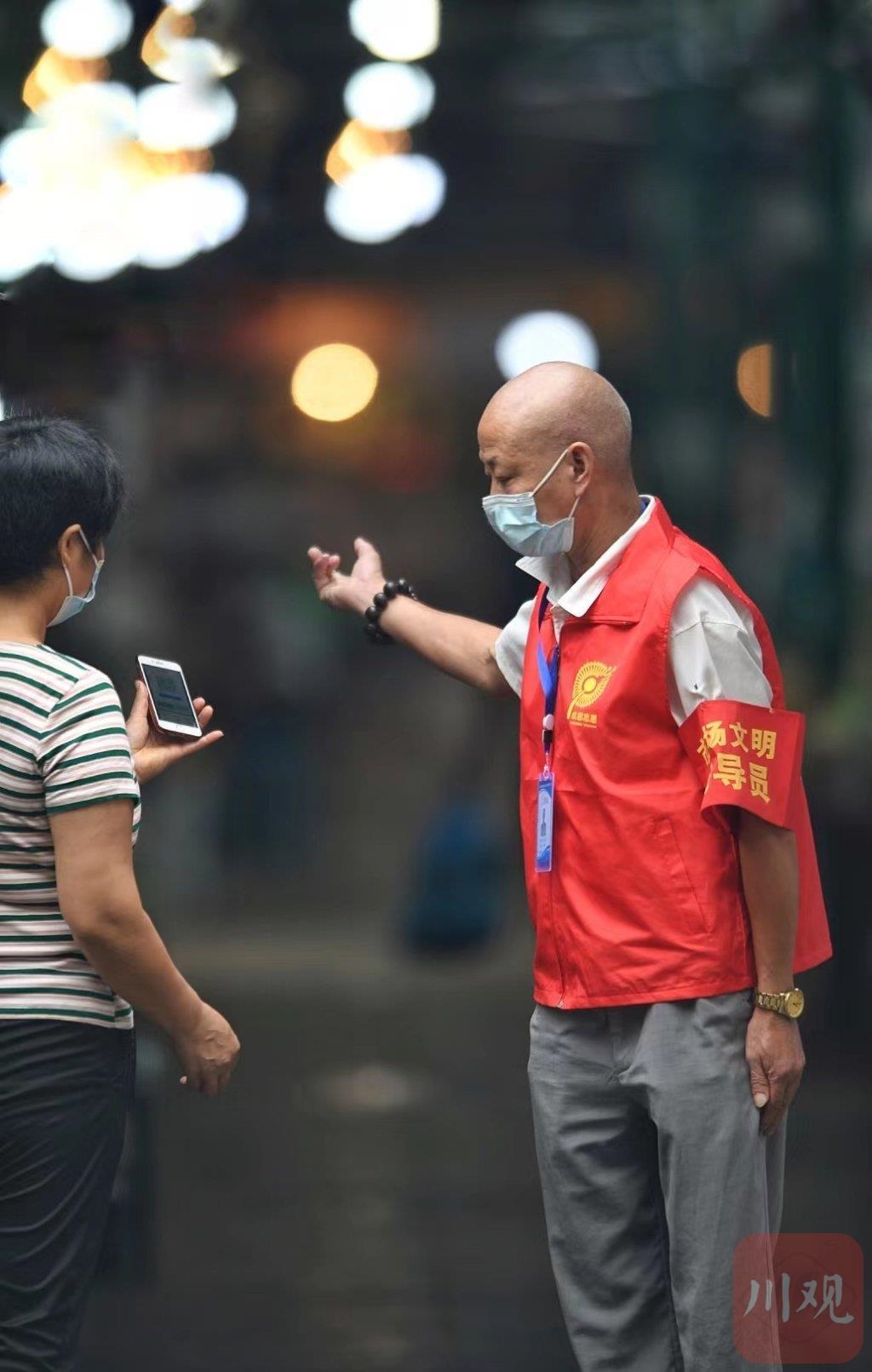 9月2日,社区劝导员在成都市陕西街菜市场对进入市场的市民进行核酸绿码验证。