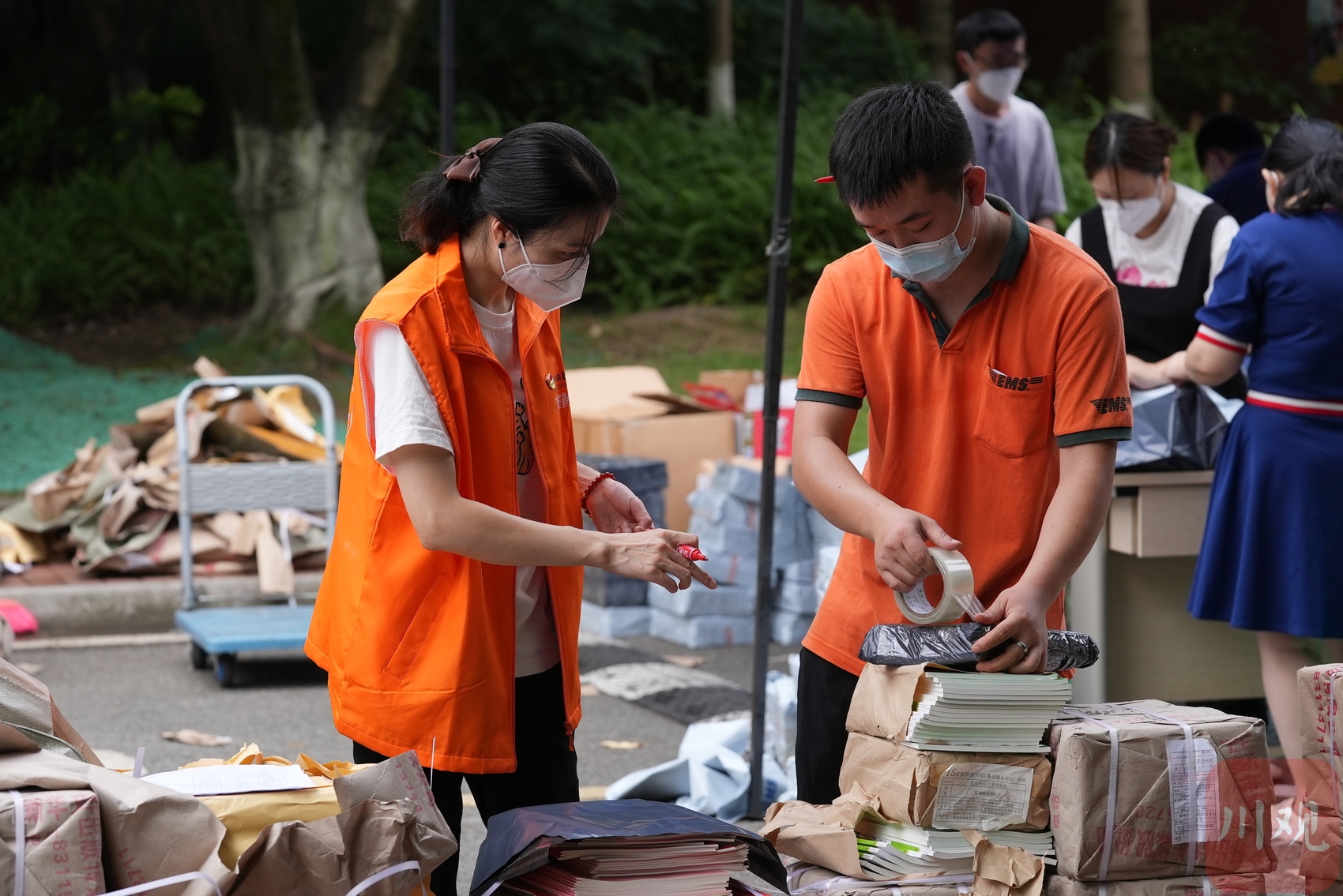 9月4日上午11点过,一顶蓝色的帐篷搭在了成都市高新区的一所中学门口,帐篷下摆放着两排长桌,中间留出过道,学校里的老师和安保人员正用手推车把成捆成捆的新教材送到校门口,摆放在帐篷的四周。“昨天晚上我们就在对接高新区的中小学,了解他们有没有教材邮寄的需求,然后今天上午我们就接到了这所中学的通知。”成都高新区邮政分公司副总经理李雪琴告诉四川在线记者,由于时间紧、任务重、人手少,我们第一时间组织了党员突击队和分公司的干部员工参与教材收寄工作,力求在9月5日该校学生进行线上教学的时候,都能及时地用上教材。