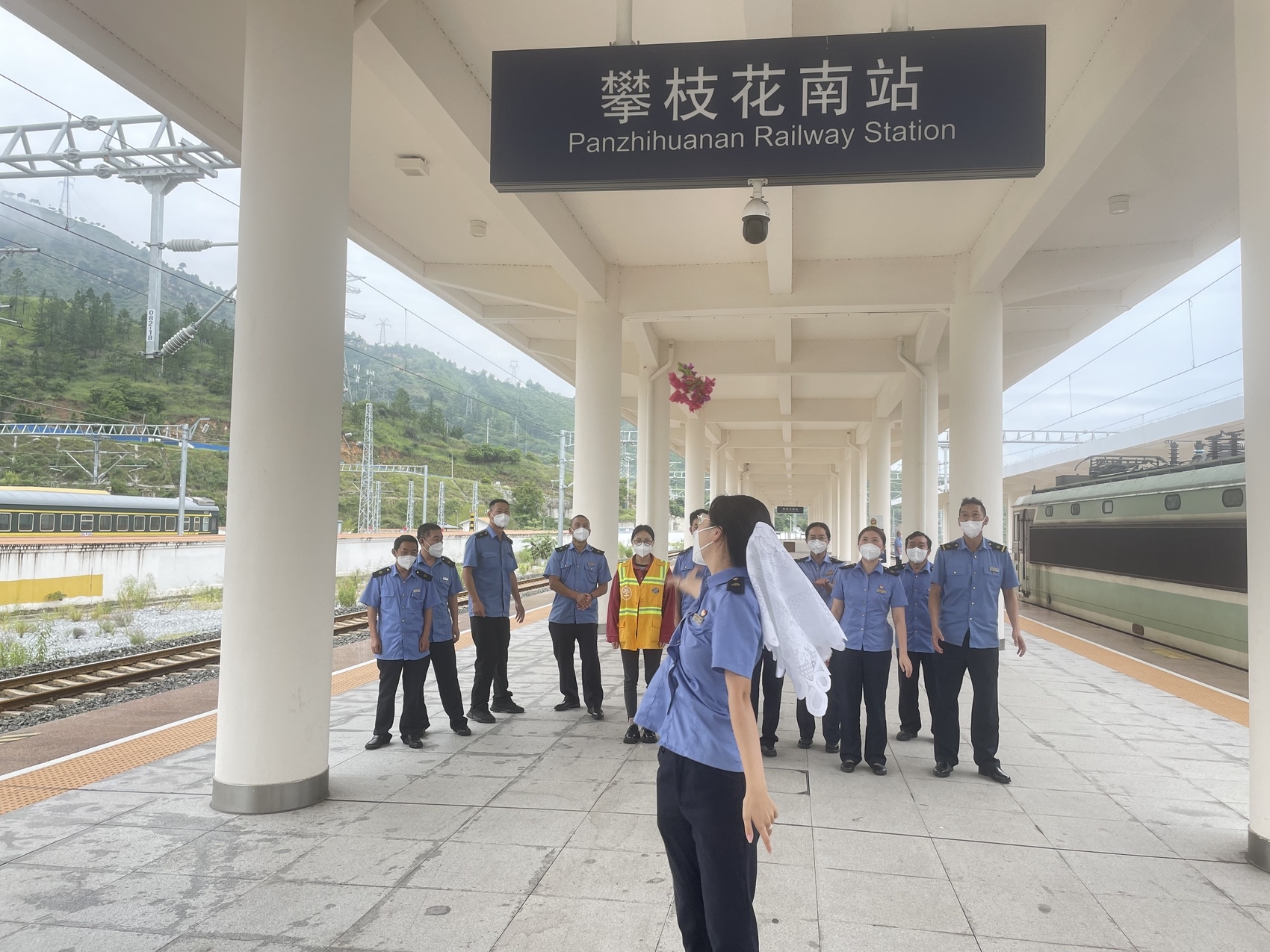 站台婚礼后,新人和同事在攀枝花南站候车大厅合影留念。