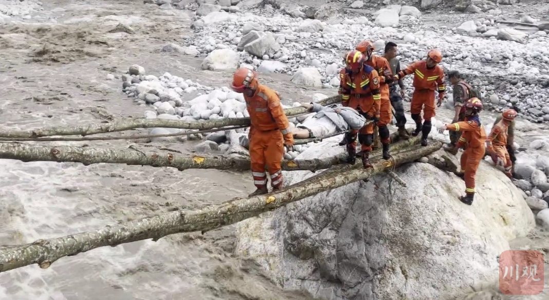 湿滑的大树让救援人员很难站稳脚步,脚下是刺骨湍急的激流。大家只能一步一步往前慢慢转移。过了木桥,还有险滩,山上滚落的巨石砸毁了路基,武警官兵和森林消防救援人员一边抬着伤员,一边清理道路艰难前行。