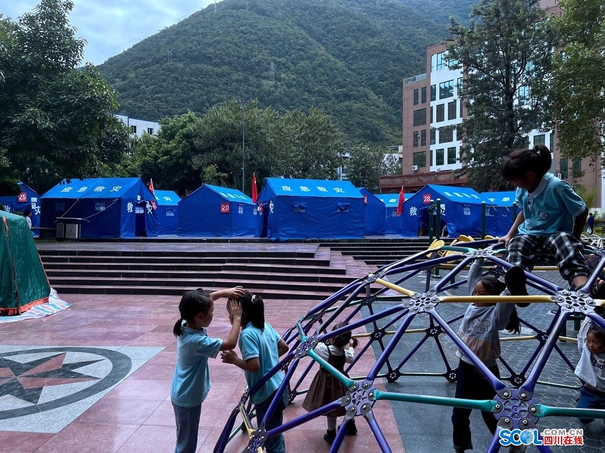 9月6日,四川在线记者抵达石棉救灾指挥部,穿过县城,往新民藏族彝族乡方向突进,沿途看到,新棉街道的蓝色应急救灾帐篷搭建在空旷处,灾区群众住进了安置帐篷,老人在休闲、孩子们在游戏,“住进了救灾帐篷,心里不慌了。”正在帐篷里用手机看新闻的李大姐说。