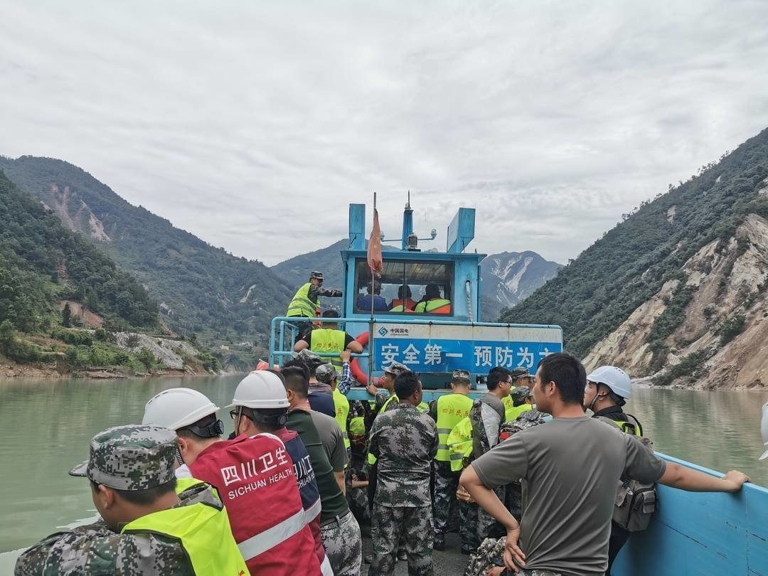 坐船时已经是下午3点过,大半天时间里,突击队员仅靠自身带的一些干粮充饥;携带的饮水有限,要非常节约,只能稍稍抿两口润润嗓子。到达爱国村后,前往草科乡的道路愈发艰难,几乎每隔几十米就有一处塌方,有的还在不断掉落碎石。“这是我遇到过最难行走的救援道路”,突击队队员给随行的封面新闻记者讲。历经10小时左右,傍晚6点,突击队一行人才终于抵达草科乡。