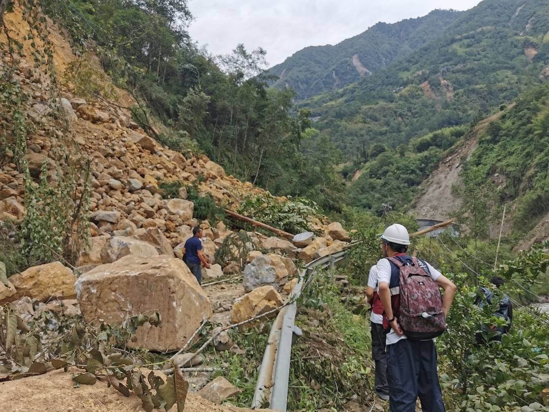 穿越了长达1公里多的隧道后,突击队迎来了第一个塌方路段。碎石已经淹没马路,而边上又是悬崖,十分危险。这段路大家每一步都走得很慢,每一脚都必须踩得很稳。仅仅一小段路程,却让大家绷紧了神经,衣服已悄然湿透。而这样的塌方路段在前往草科乡的路上,数不胜数。