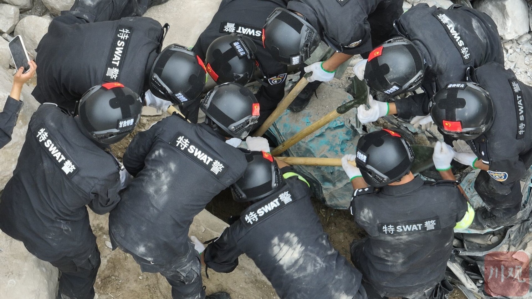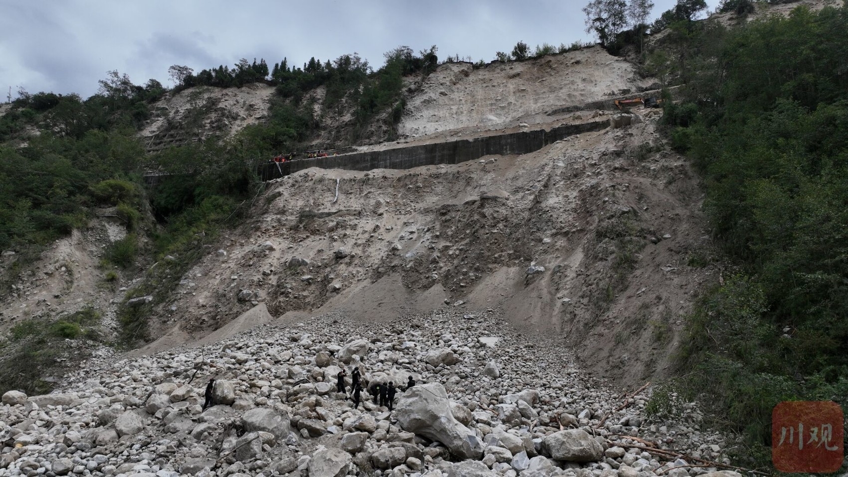 9月7日12点半左右,磨西往景区公路抢通施工,在掘进至1公里左右处时,施工人员发现崖下河边步行道乱石堆中,露出疑似的蓝色车辆。施工人员马上停止施工并报告。甘孜特警赶来支援,正在现场施救。