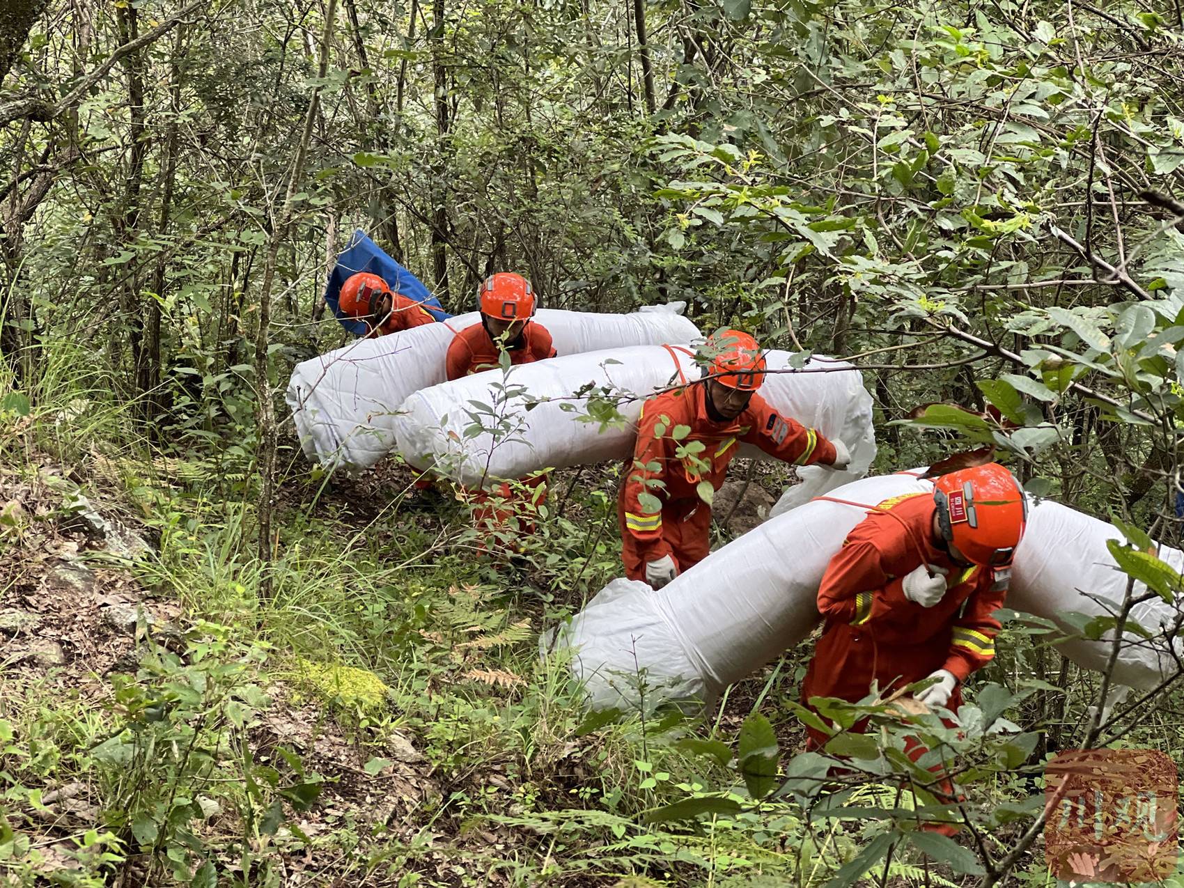 由于目前道路仍未抢通,9月7日上午8时,甘孜州森林消防支队队员从得妥镇金光村爬山入林,采取人力背运方式徒步约5公里,将20顶帐篷运送进村,这些帐篷单个就重达120斤。
