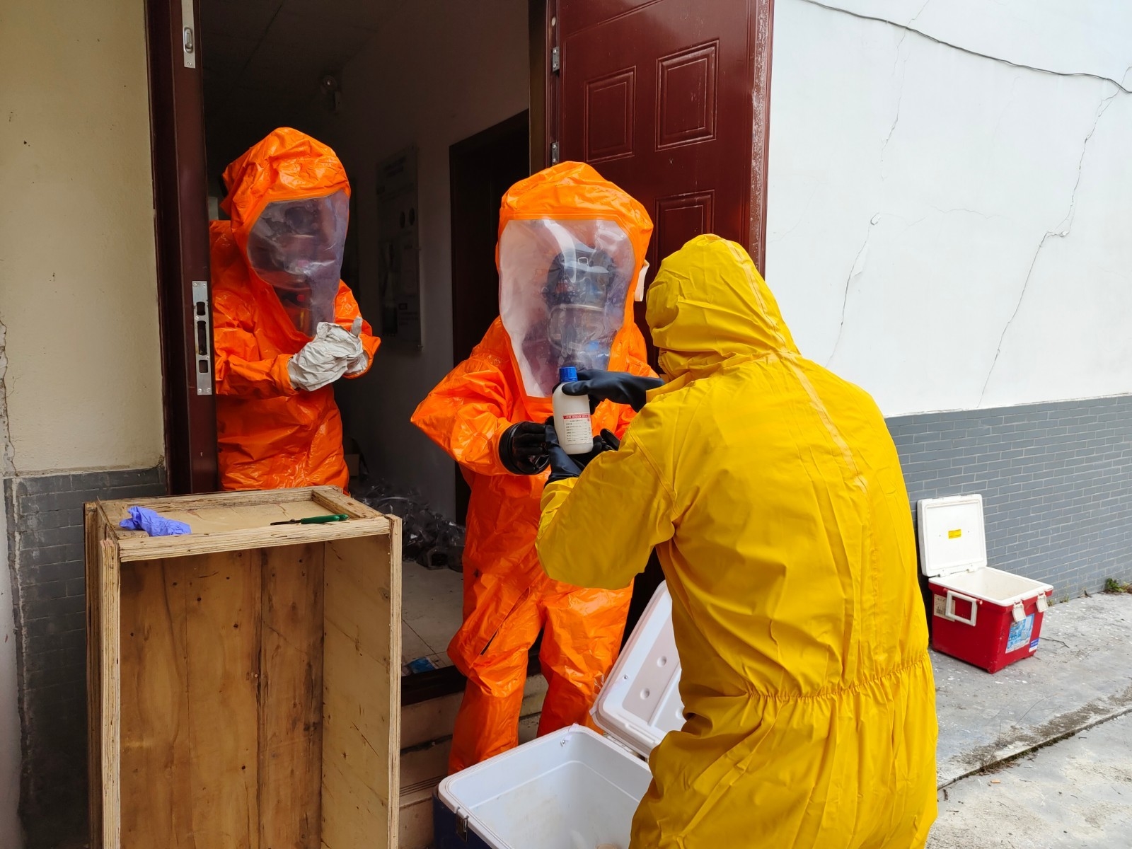 10时30分,危化品抢险分队12名队员划分成5个小组,采取“先通风后处置、先侦检再识别、先确认后转移、自上而下”的方式,从科研场所楼宇外向内展开处置。11时7分,抢险分队完成房间破拆。11时36分,抢险分队开始转移处置危化品。
