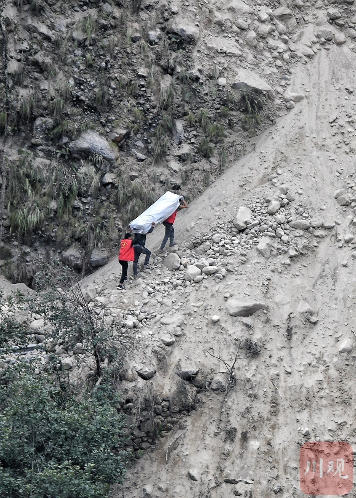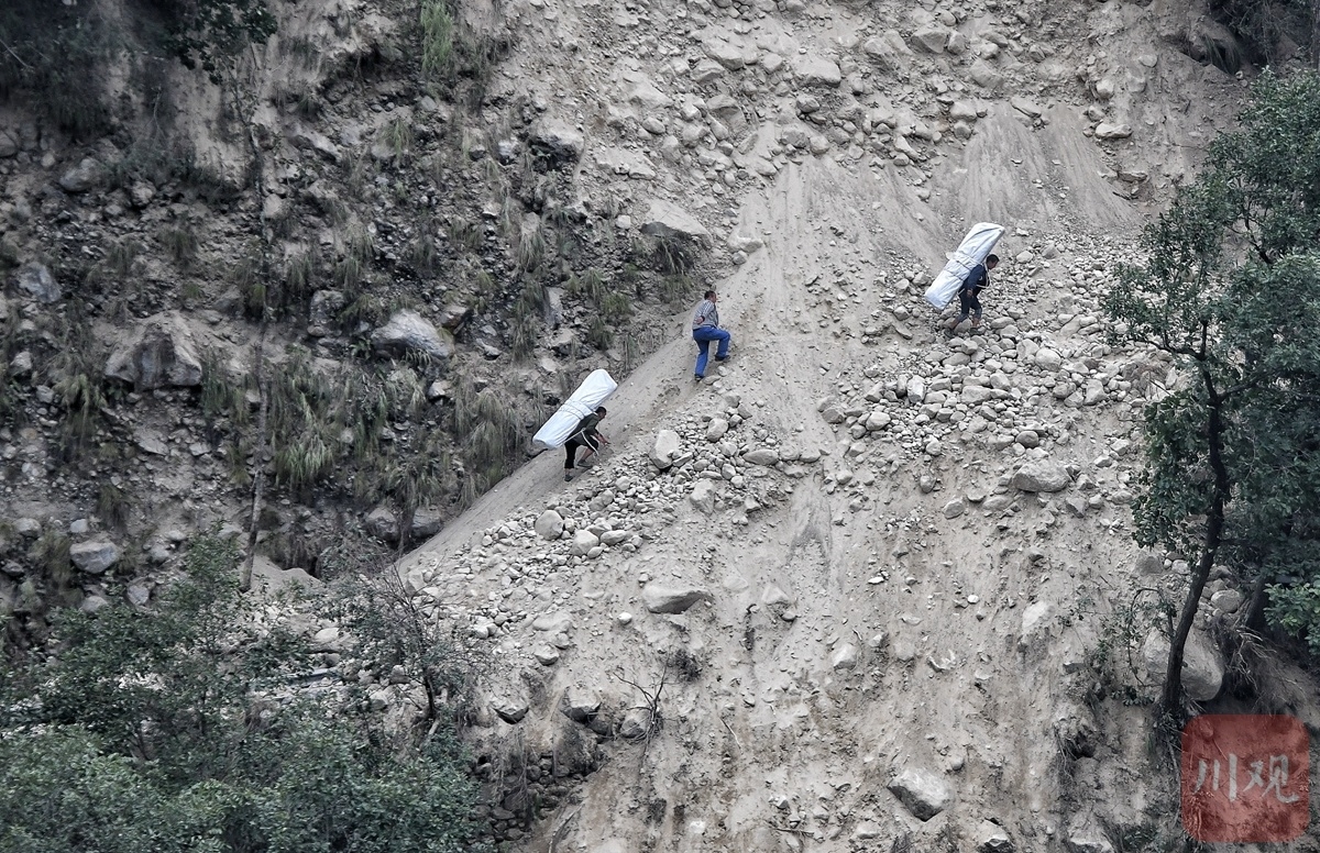 村民出、救援进。另一边,天气变化,山雨欲来,钢架桥下河水汹涌,武警救援人员身背百余斤重的帐篷,徒步走过烂石滩、爬上陡峭的山野荆棘丛,向共和村进发。在上山一处危险重重的滑坡段,负重徒步难度加大,救援人员相互配合,将帐篷交与在此等候的村民,村民再多人一组,步行将帐篷抬进村。据武警四川总队现场救援人员介绍,今天下午已运送帐篷10余顶,基本能保障村民今晚下雨应急。