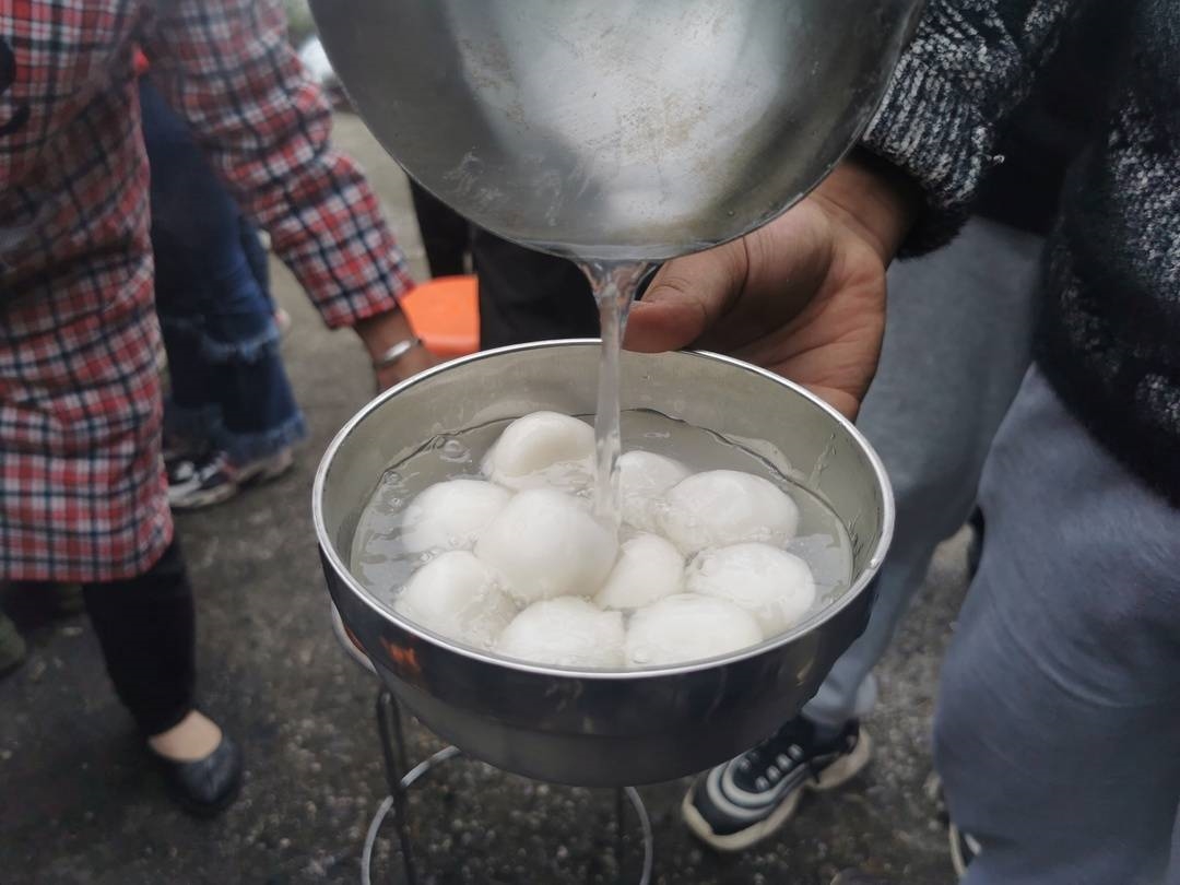 到了午饭时间,挨着农家村党群服务中心的安置点,一颗颗小汤圆被放入滚烫的开水。一旁的圆桌上围坐着老人与小孩,他们将优先享受“手工汤圆”这道美味。